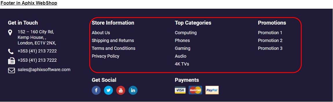 The footer on each page contains useful links for your customer; including store details and top categories and/or promotions.