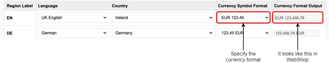 The screenshot shows the configuration screen in Management Interface, and how products are displayed in WebShop with the different currency formats applied.