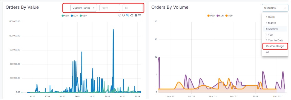 We want the sales graphs included on our Dashboard to be useful for you, so we’ve added a Custom Range option where you can retrieve and display your “Orders by Value” and “Order by Volume“ data with customisable start and end dates.
