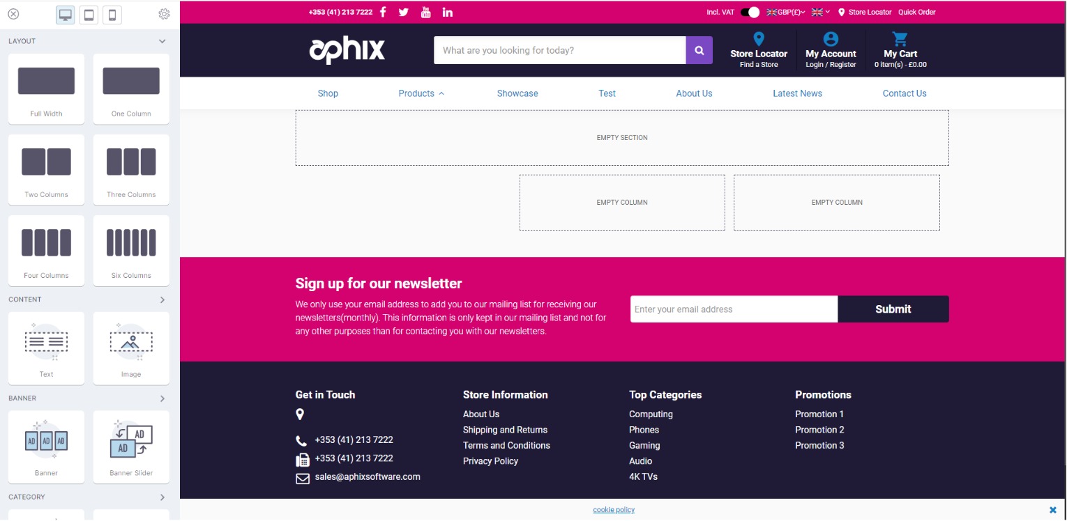 Visual Page Builder lets you customise content in your Aphix WebShop using intuitive drag and drop functionality and interactive configuration controls so that your brand and content shine. Accessed through Aphix WebShop, it gives you the power and flexibility to add, update and delete content on the go!