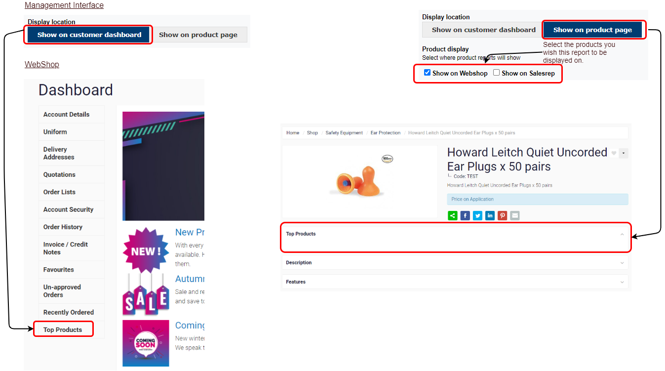You can provide access to your customers to Custom Reports in either the WebShop Dashboard menu or as a tab on a product page. Additionally, for product reports, you can specify where (WebShop and/or SalesRep) the custom report is displayed.