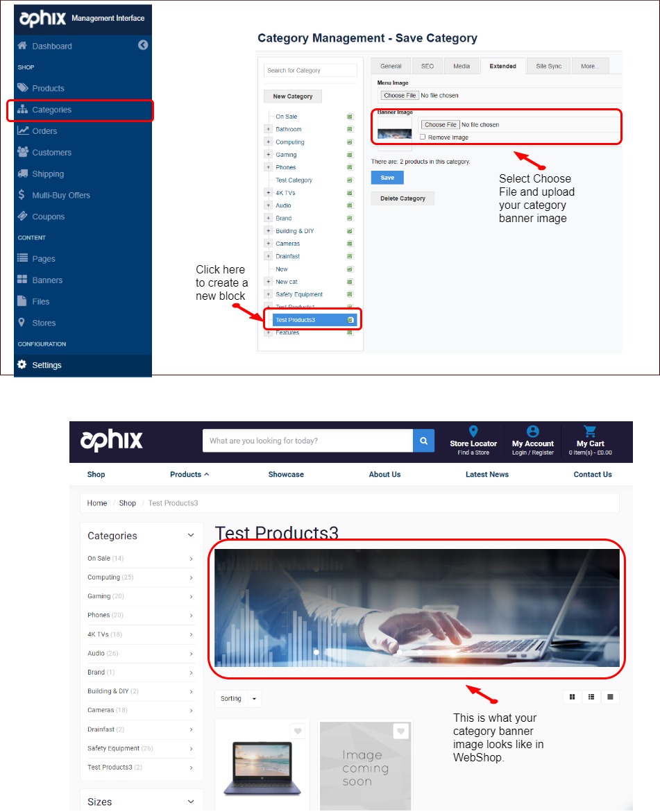 To do this, open Category Management in your Management Interface and click on the category where you want to add the category banner image. Go to the Extended tab and add the image under Banner Image. Click Save to immediately update your WebShop with your new banner image.
