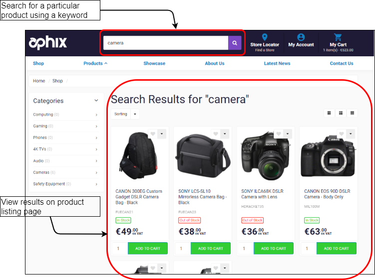The Search feature allows your customers to find products in your catalogue by searching for the product using product codes and keywords. The results are displayed on a product listing page, as shown: