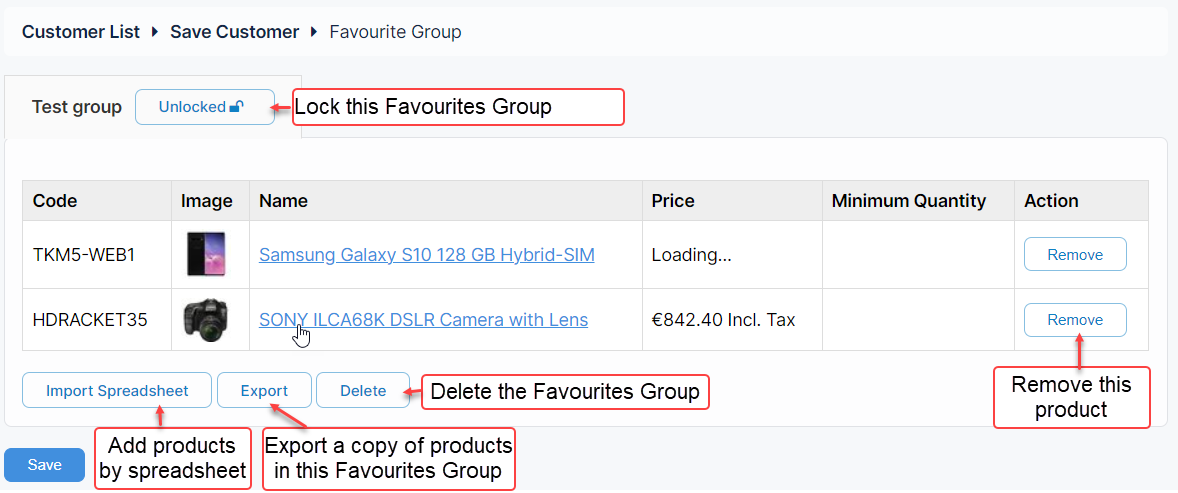 Click Remove to the right of the product you wish to delete from the Favourites Group.