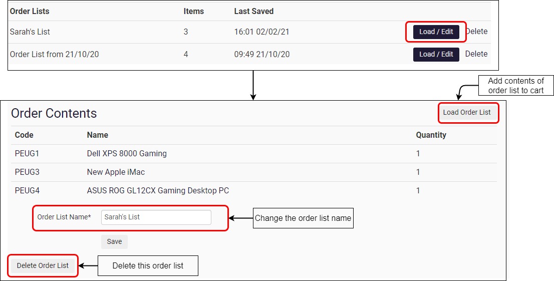 To view, edit, load or delete an existing Order List, open Saved Carts (found on the side menu in Account Dashboard).