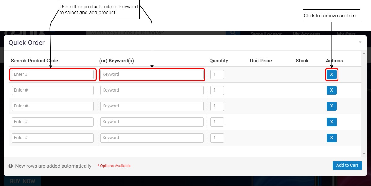 Quick Order provides functionality to quickly create a list of products to purchase, and to add that list to the Cart at the same time.