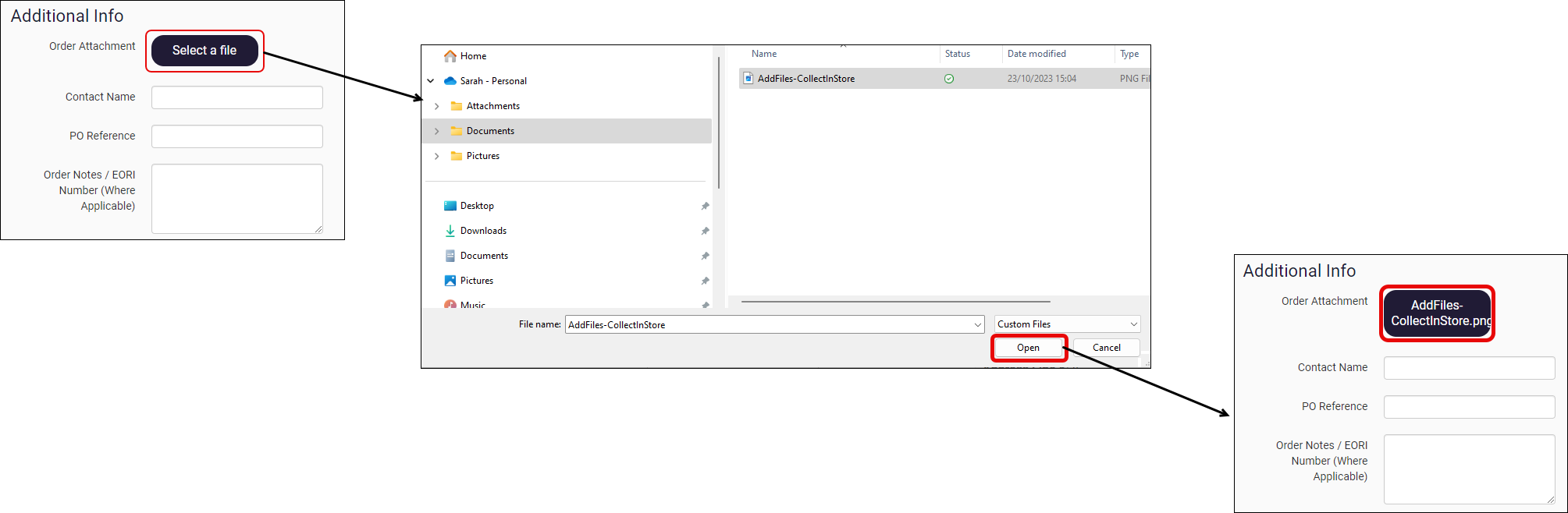 Once this feature is switched on, your customer clicks Select a file under Additional Info on the Delivery Details screen, locate the file using the File Locator and upload it. Any files uploaded are stored on our platform once the order has been placed in your ERP. These files are not synced to your ERP.