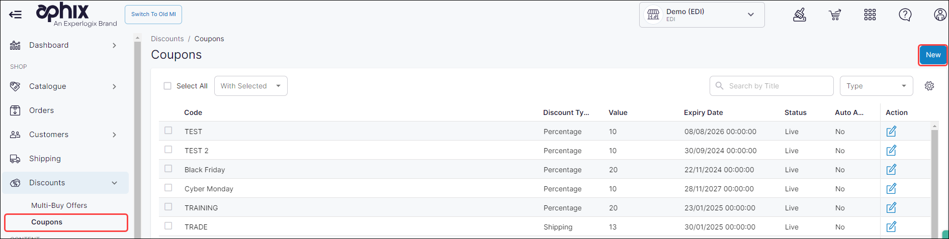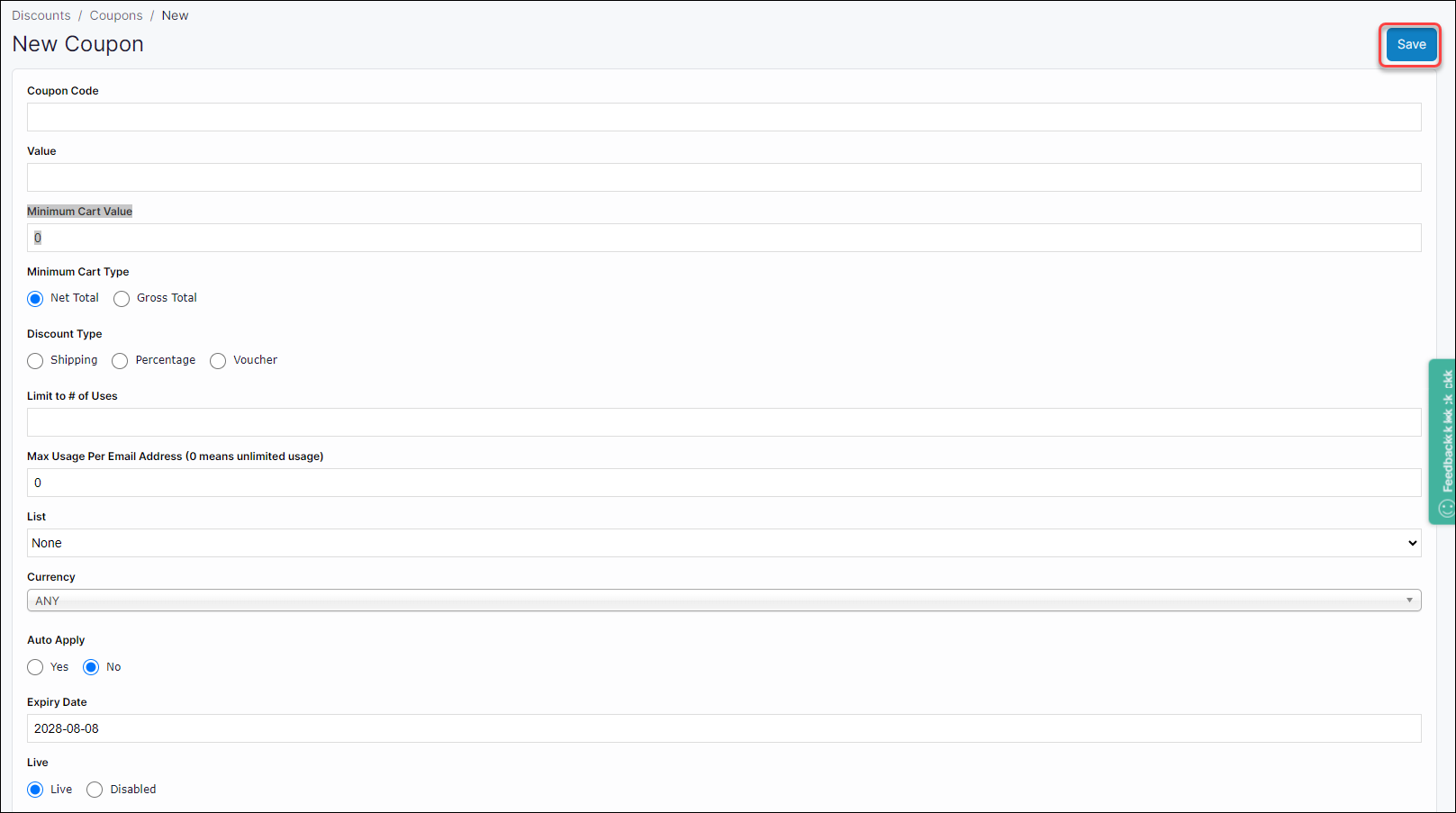 Click New, located at the top right of the screen. This opens a New Coupon screen.