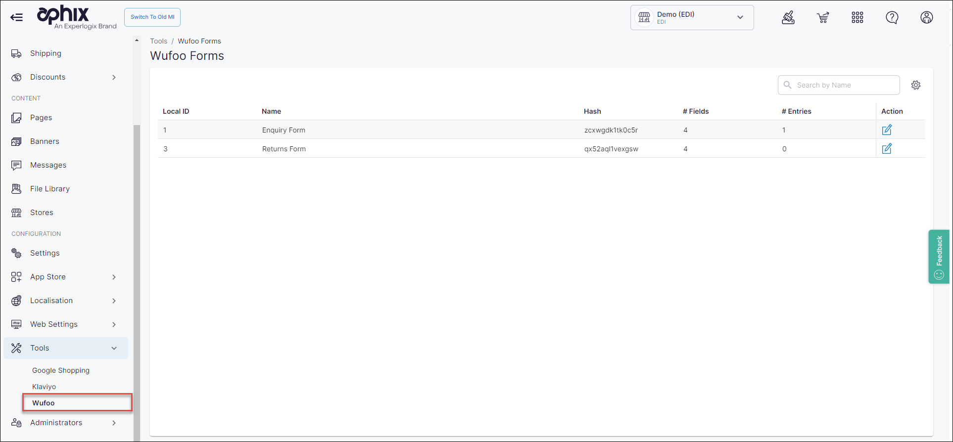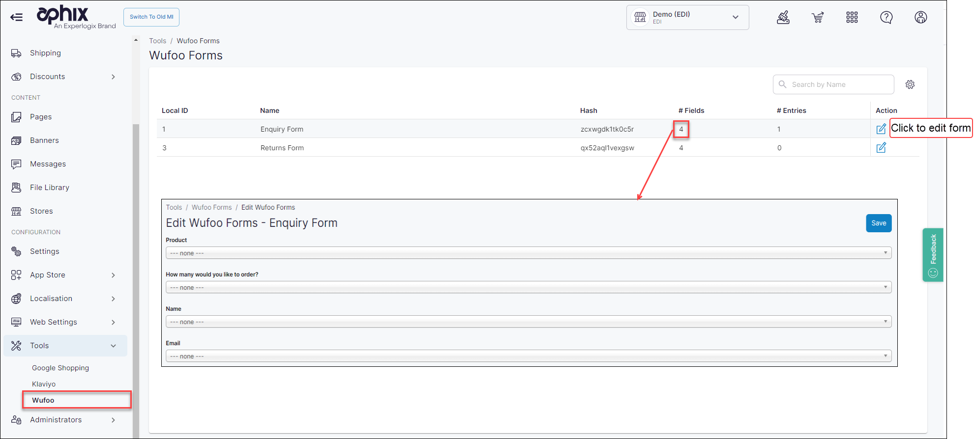 However, Management Interface maintains a cached version of this list, which is used should the connection between Wufoo and Digital Commerce not operate for any reason. A warning is displayed if the API cannot be reached, and the data retrieved from Wufoo. If the API is not available or unreachable, the cached forms and fields are displayed. You can use these to edit fields or assign values. cached forms and fields can be edited.