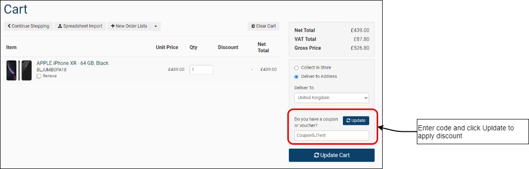 To add a coupon or voucher, enter the code into the box labelled: “Do you have a coupon or voucher?“ and click Update. This verifies the coupon or voucher, and if valid applies the discount to the cart total.
