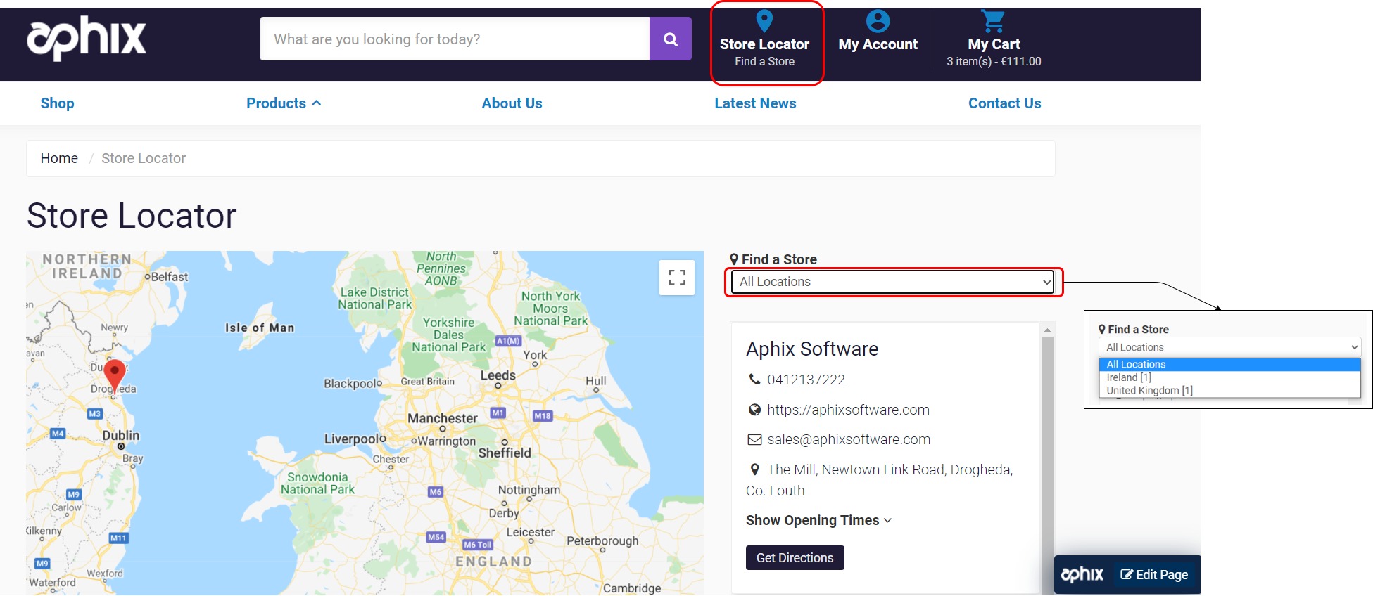 The Store Locator feature is located on the top menu bar in WebShop. Your customers can view the list of your store locations and details about them by clicking on Store Locator.
