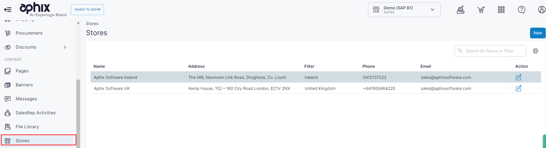 To view the full list of your store locations, select Stores under Content in the left side menu. This displays your store list, and provides you with options to search, create or edit.