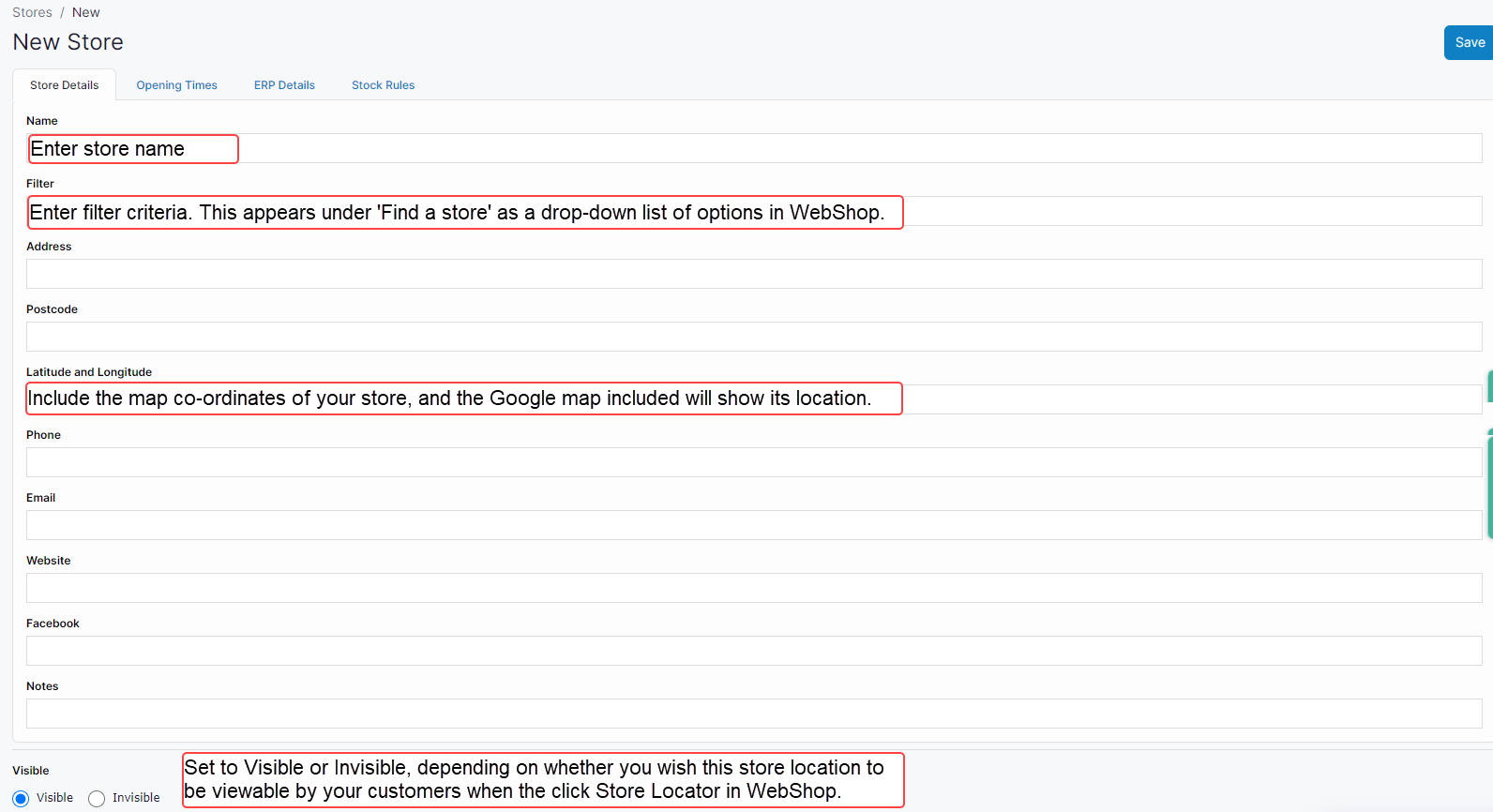 Store locations are immediately visible on WebShop once you set the Visible field to 'Visible' and have saved the information.