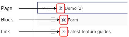 The icons representing each element (block, page or link) are shown below.
