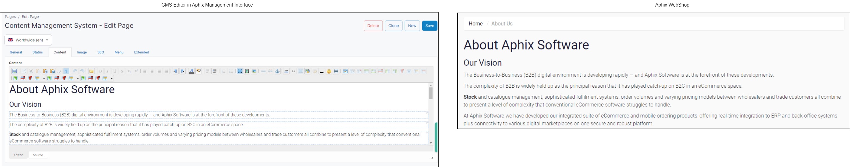 Pages, our Content Management System, allows you to customize the content in your WebShop so your brand and your products shine. Content can be created for WebShop either using Pages in Management Interface or Visual Page Builder in WebShop.