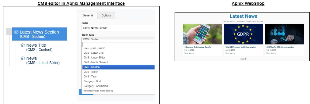 For example, the Latest News section contains two blocks - a “CMS - section” block and a “CMS - Latest Slider” block. The CMS editor opens up with options associated with creating and editing blocks. There are many block types, each of which has a different purpose.