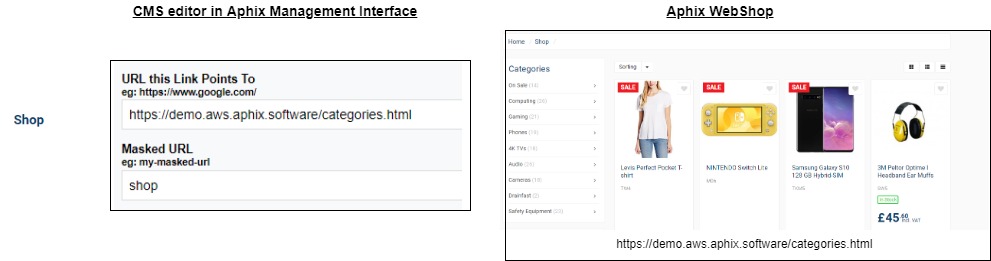 A link points to a target page within the navigational tree. For example, “Shop” [found in the header] is a link to the product listing pages, from where you can add products to your cart and place your order. The product listing pages are structured within their default categories as you have set them up. The CMS editor opens up with options associated with creating and editing links.