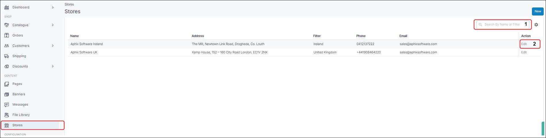 The Stores screen displays a list of existing store locations that have been added to your system. Create a new store location or edit an existing one. Typically, store locations are displayed in the header and footer of each WebShop page.
