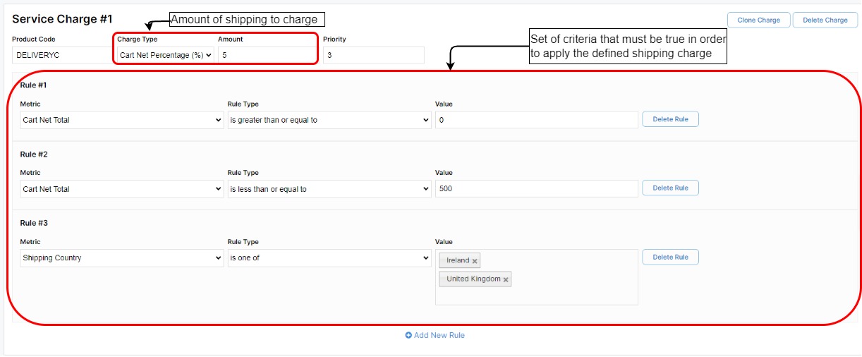 Select a metric, rule type and value to define when to apply this service charge to the Cart. The list of metrics includes cart net total, shipping country, shipping zone, customer code, customer group, cart contents and any pricing property that has been imported from your ERP and mapped to the pricing table on our platform. Each metric has a different set of rule type associated with it, based on the metric type. All the rules in a service charge must be true for the associated shipping method to be applied. Within a service, a priority can be applied to each service charge with the highest priority being applied first.