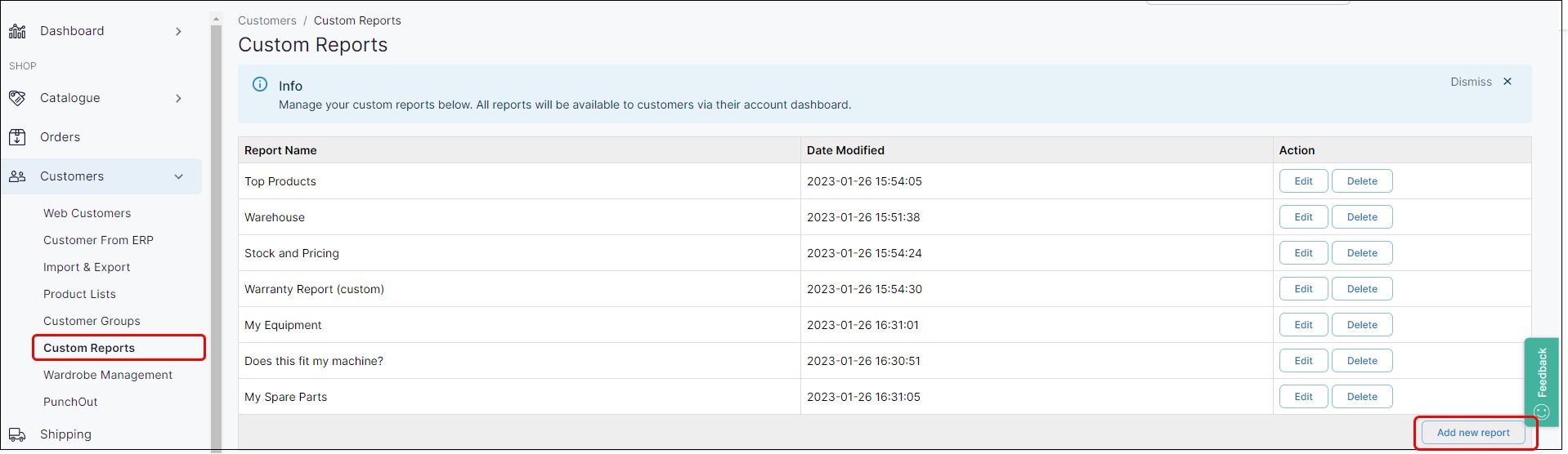 As a merchant using SAP Business One, you may wish to extract information from your ERP to share with your customers on WebShop or SalesRep. The custom report feature allows you to create, edit and delete custom reports that contain either customer-specific or product-specific information that you require. You manage these reports in Management Interface. Custom reports can be displayed on WebShop and/or SalesRep.