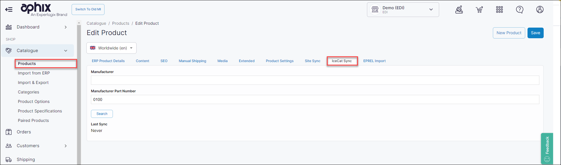 Once this feature is switched on, use it to import product data from Icecat into your Digital Commerce product catalogue. At a high level, you create a product (either import it from your ERP or create it manually in Management Interface). Within the Product Content Editor, you can search for and retrieve data directly from the Icecat product catalogue for a specific brand and product. Once the data has been imported, you can modify it, and include extra information if you wish to. Once you save the product, it is visible in your WebShop.
