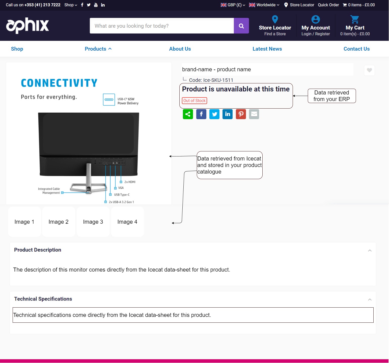 Once you've imported product data retrieved from Icecat into your product catalogue, your customers can view that product in WebShop along with data (such as pricing, stock information and so on) retrieved from your ERP.