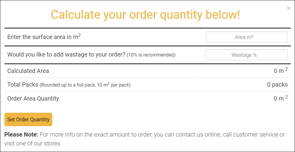 The Square Metre Calculator (SQM) gives your customers a tool that helps them calculate how much of a certain product they require to purchase. Only visible on products where a square metre value is available for use and where the product has a predetermined pack amount. Once your customer enters the data, the amount of product required is calculated. The SQM value is listed on the product page, and is converted to the appropriate number of packs when the product is added to the Cart.