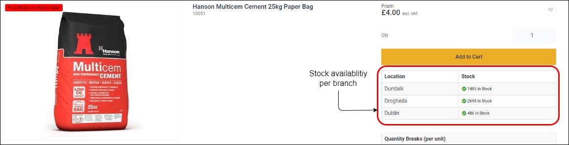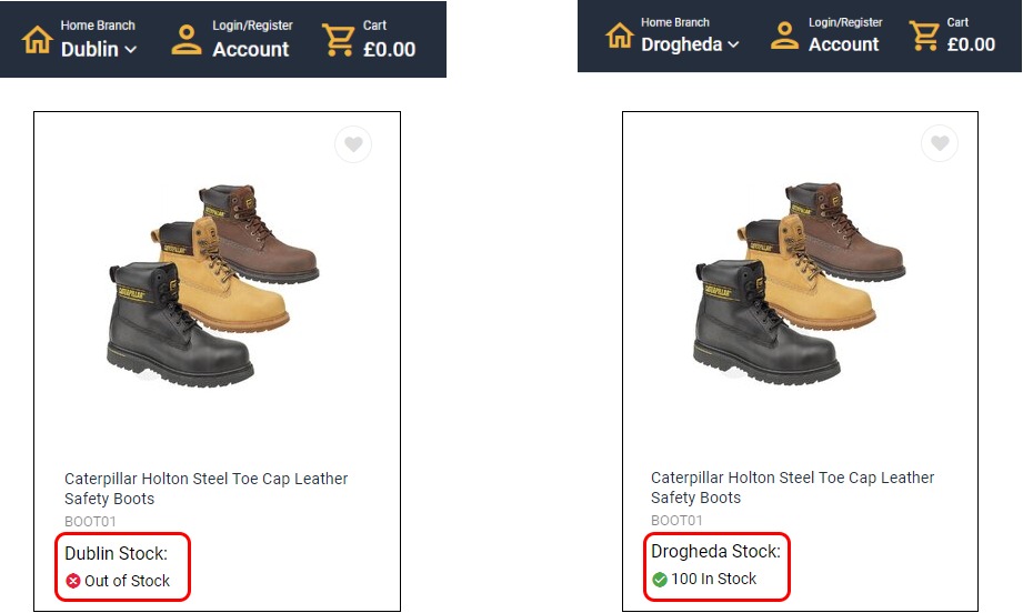 On the product listing page, your customer selects their branch, and the product listings display stock available for that branch.