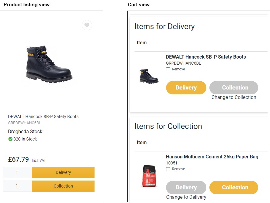 As a merchant, you may wish to offer your customers the option to collect some products while having others delivered to them. Our split cart feature allows your customers to specify if they wish to get delivery or collect products as they add them to their Cart. At Checkout, your customer is presented with details of the orders they’ve selected for Delivery and Collection. Existing checkout restrictions, such as minimum order quantity or value, are applied to the order.