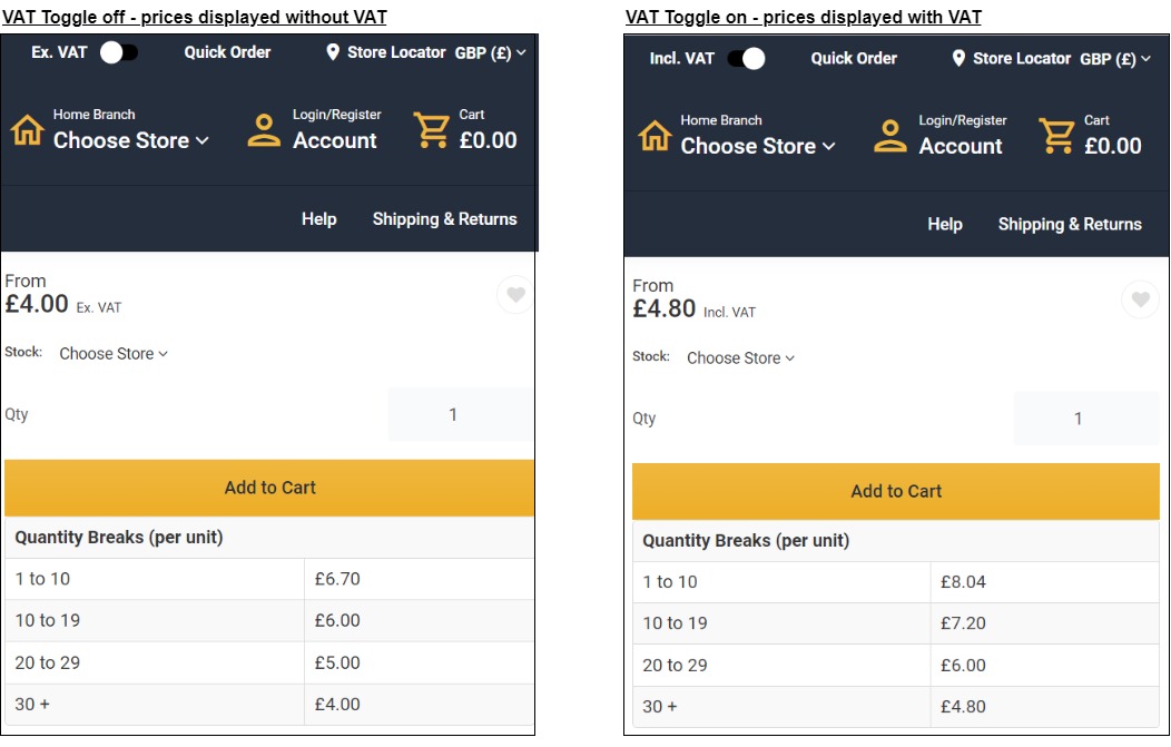 The VAT Toggle feature allows you to display prices with or without VAT.