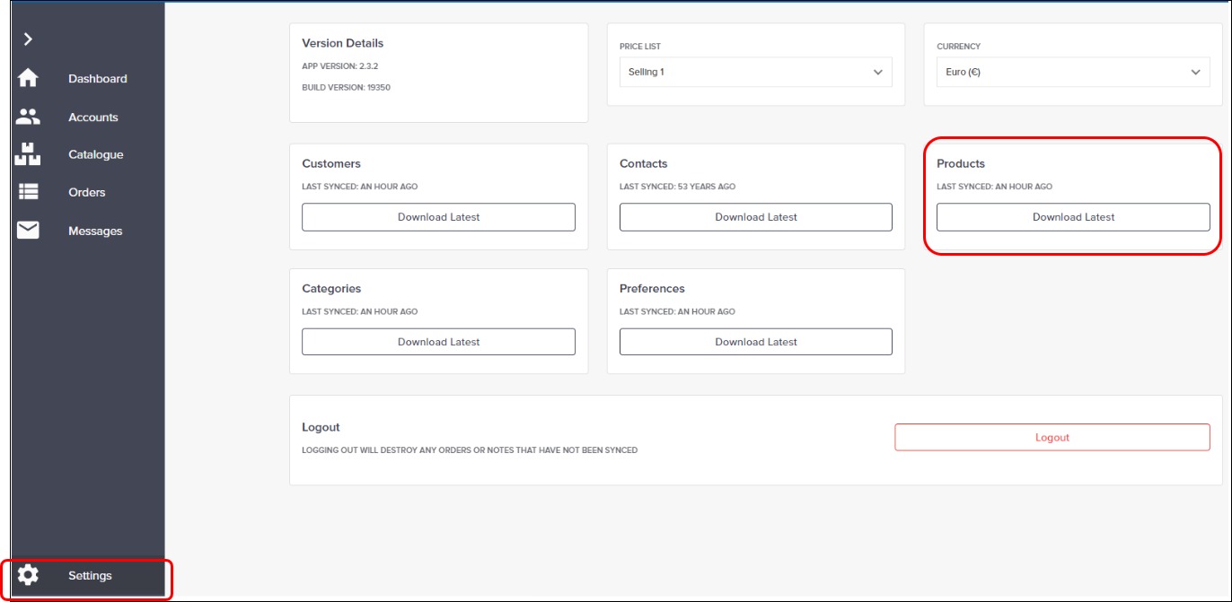 To sync your customer list, click Settings. This opens the Settings screen. Click Download Latest under Products to sync your product catalogue.