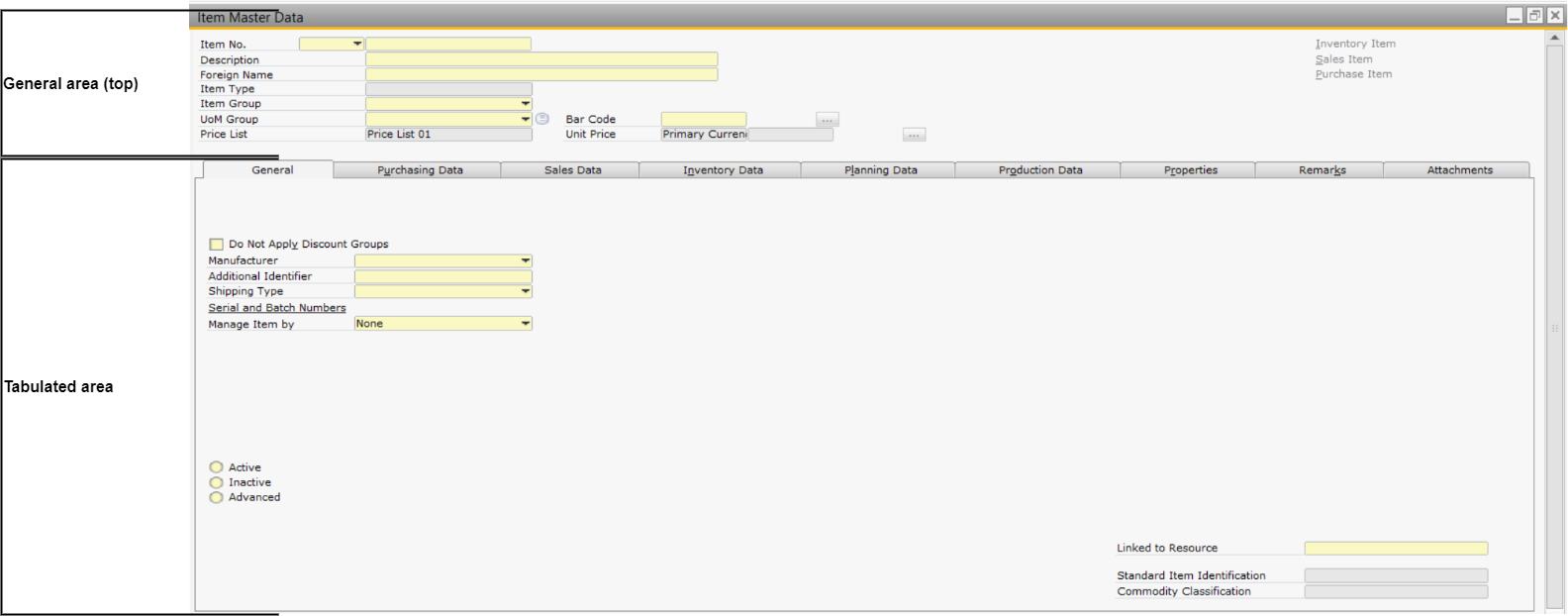 Your product catalogue in PocketShop are mapped from the fields listed on the Items Master Data screen in SAP Business One. For clarity, the mapping tables indicate the section as shown in the screenshot and field name listed on the screen in SAP Business One. The Items Master Data screen in SAP Business One is divided into two main sections, as follows: