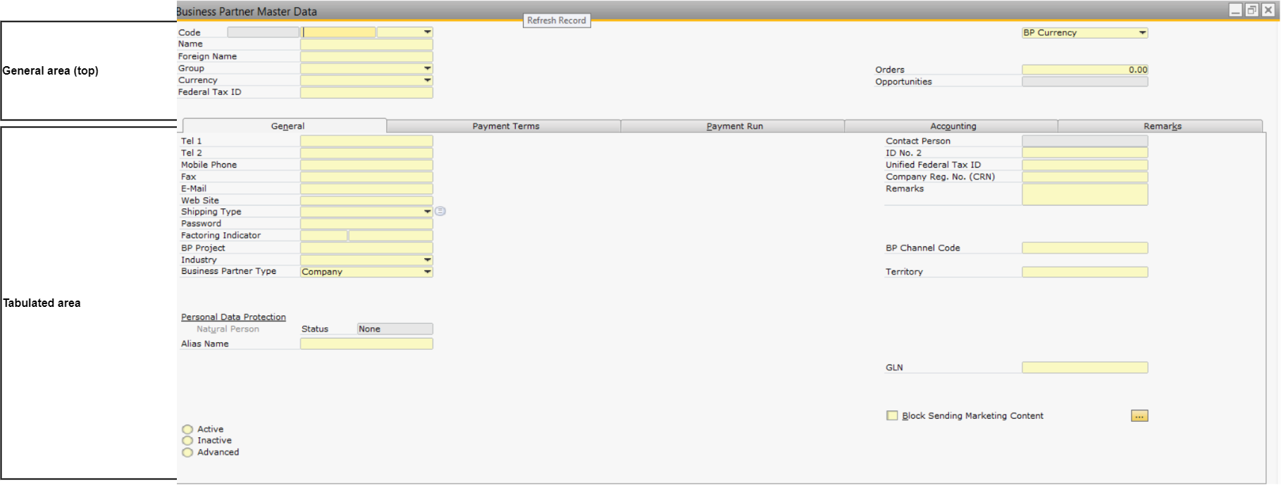 The Business Partner Master Data contains your customer's data. PocketShop uses Digital Commerce Platform's standard web service calls to send data to and retrieve data from SAP Business One. For clarity, the mapping tables indicates the section as shown in the screenshot and field names listed on the screen in SAP Business One. The Business Partner Master Data is divided into two main sections, as follows: