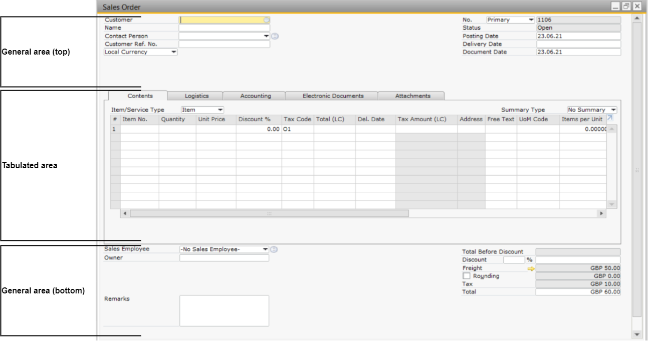 Fields in PocketShop are mapped to the fields listed on the Sales Order screen in SAP Business One. For clarity, the mapping tables indicate the section as shown in the screenshot and field name listed on the screen in SAP Business One. The Sales Order screen in SAP Business One is divided into three main sections, as follows: