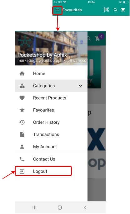 To logout from PocketShop, select Logout from the drop-down menu, as shown.