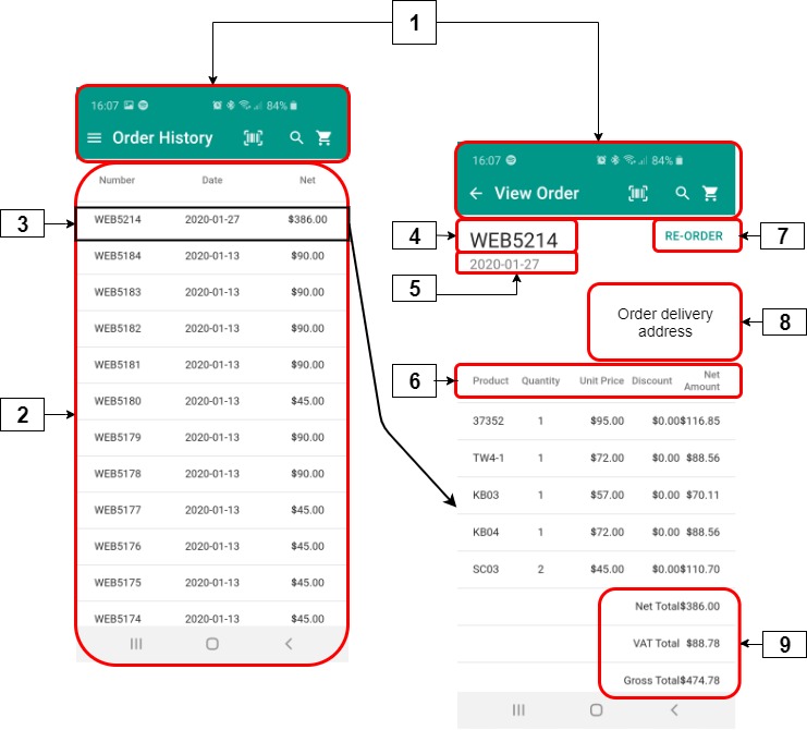 1 | Top bar | Order history | Contains the set of options available on all PocketShop screens. |
