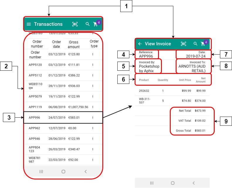 Click | Contains an example transaction. Click on the transaction to display the order type associated with it. This transaction has the following values: Order number = APP996 Order date = 24/07/2019 Gross amount = $583.01 Order type = I (invoice) In this example, when you click the transaction an invoice associated with the transaction is displayed. | |