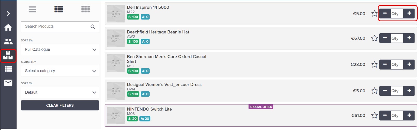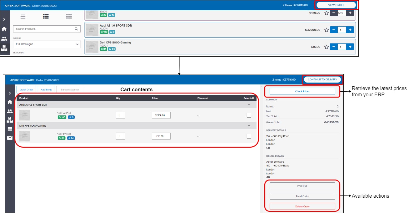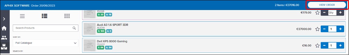 Open the product catalogue, and add items by increasing the number of the product in the Qty field, then click View Order to view your Cart.