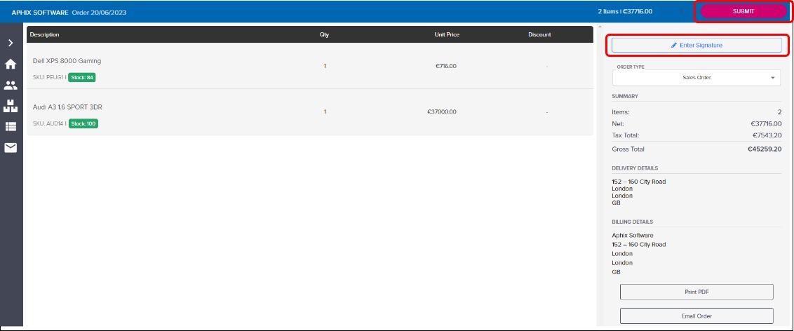 Manage your commercial documents (such as orders, proof of delivery, and so on) using the Print PDF and Email Order buttons.