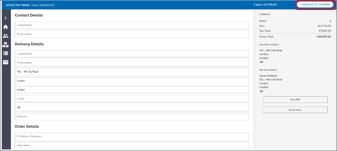 Click Continue to Confirm. This opens the sales order confirmation screen. From this screen, you can: