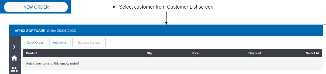 Click “New Order“, select your customer, and add products using our Quick Order feature or add items using the product catalogue.