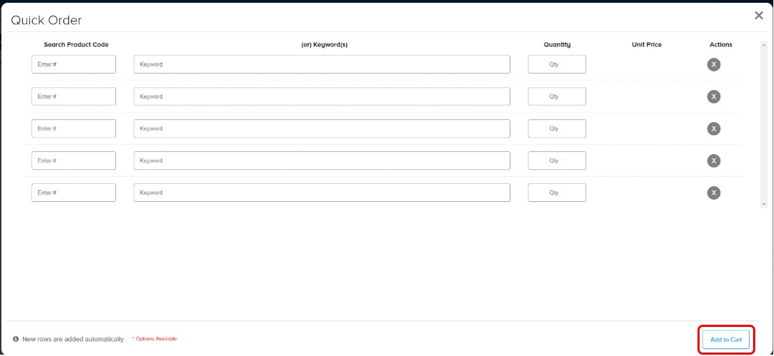 Then, click Quick Order feature to quickly add frequently ordered products where you know the SKU / product code. Rows are added automatically. Once you have completed your order, click Add to Cart, and all the items you have entered are added to the Cart. When you select a product which has options available, you can select your chosen option from the drop-down box.