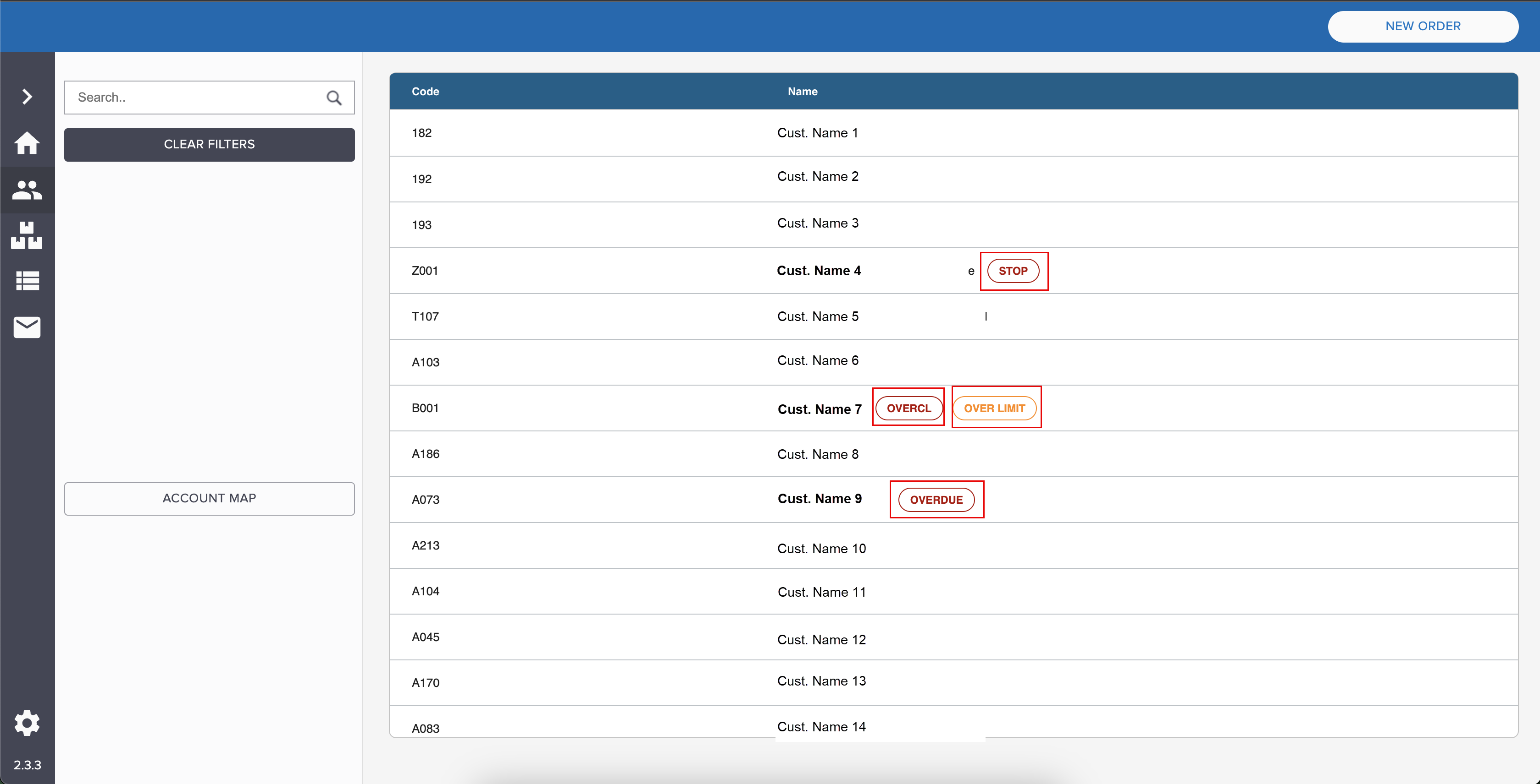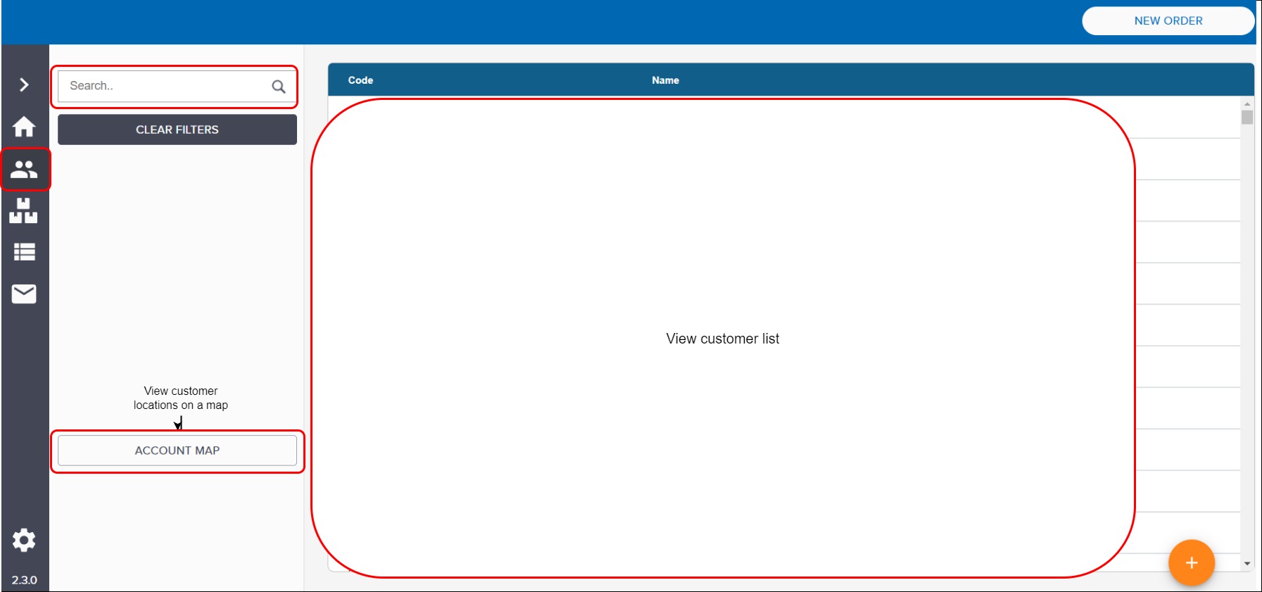 The Account screen displays a list of customers, which have been imported from your ERP. This list can be either a full or segmented list, depending on your business processes and sales strategies. From this screen, you can: