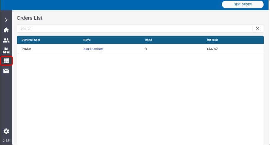 The orders list screen displays a list of any orders that have been created but have yet to be submitted to your ERP.