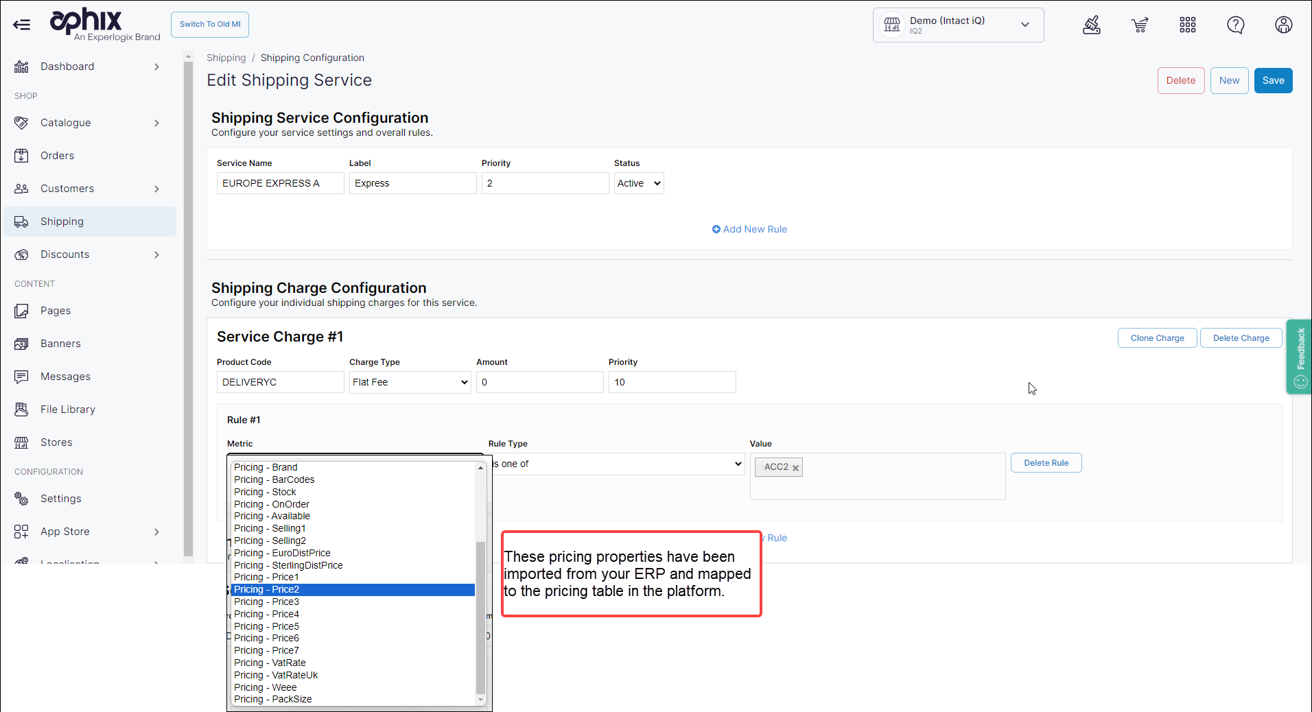 Additionally, you can configure charge rules based on properties that have been imported from your ERP and mapped to the pricing table on our platform. These charge rules allow you to configure more complex delivery charges to meet your business needs. For example, you could configure a charge rule to determine a delivery charge based on product code provided that the product code property has been imported from your ERP and mapped to the pricing table.