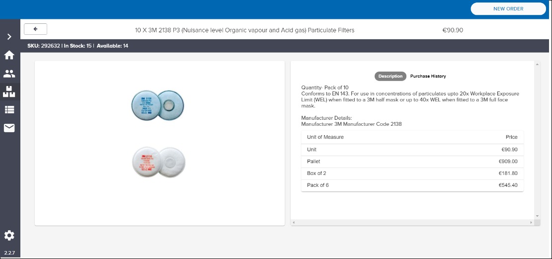 The product name, product code, description, purchase history, associated reports, up to four images, stock level and price is displayed for each product. There is a drop-down box with options available where you are using our Product with Options feature.